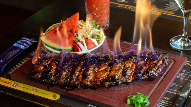 Keuze uit: zoet, knoflook, “ietsjes hot” of flaming. Door onze authentieke houtskool bereiding zonder de spareribs te koken, heeft onze spareribs een heerlijke "bite" en valt niet van het bot. onze spareribs is dan ook een waar genot voor de "echte" kluiver.