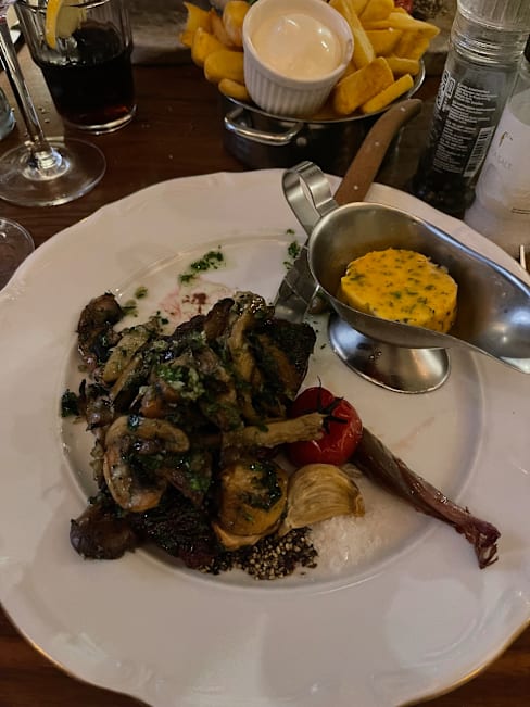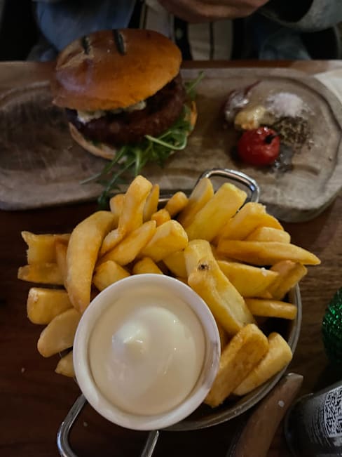 9.5/10We had the hamburger with blue cheese and a steak, both with fries (crispy, really good). The food was well cooked and the service was fast. The restaurant’s first floor is cozy. The staff was really nice, even when asked to put two phones on charge 🔋🔌 The prices are hight tho, one water 1.5L costet 8€…