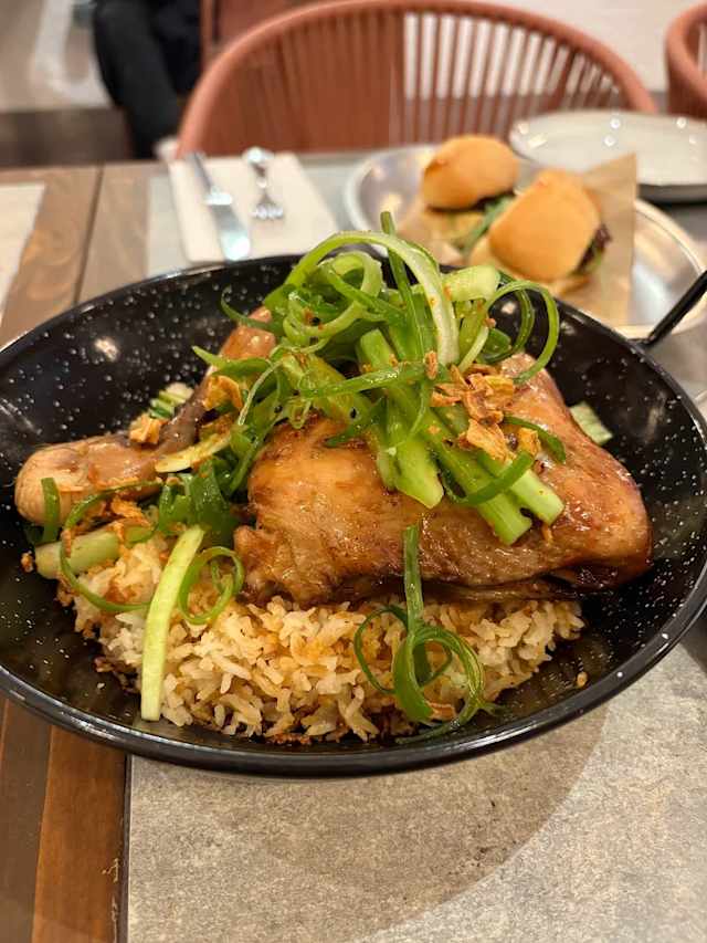 - Pollo glaseado servido al estilo clay pot, con arroz basmati y pak choy salteado
