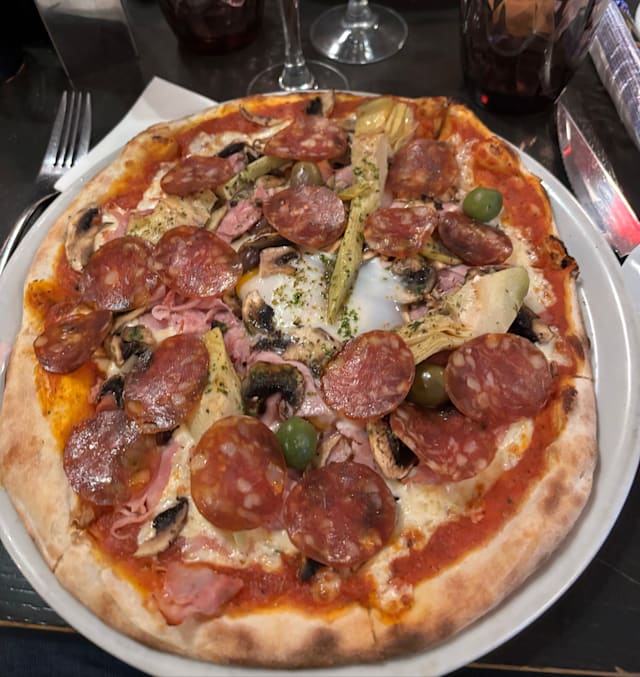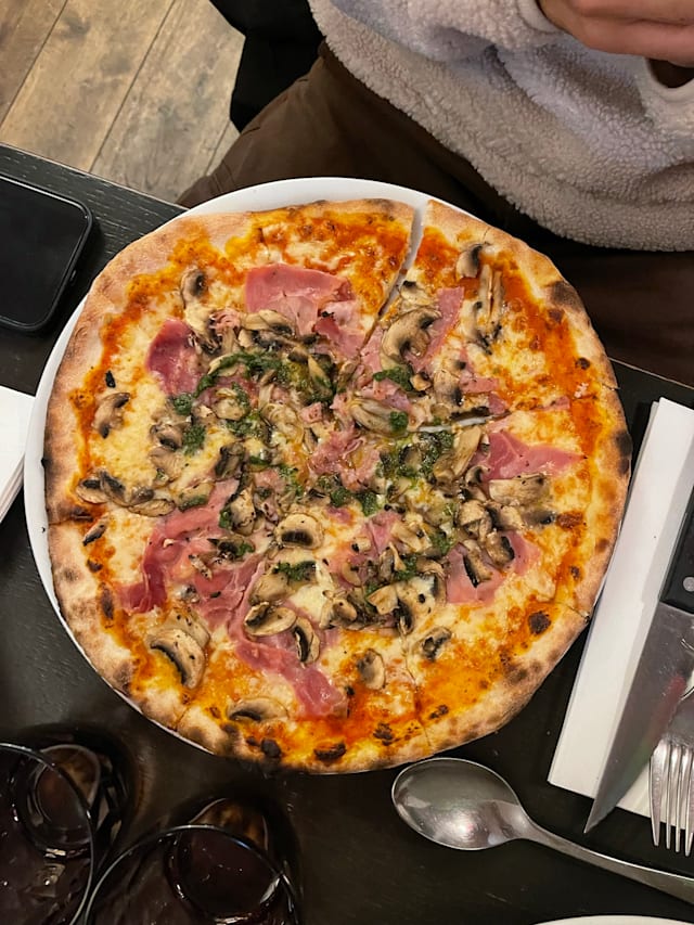 7.5/10The carpaccio and carbonara were excellent. The pizza was terrible - the base was thin and chewy and the topping bland - a Tesco frozen pizza would have been better.