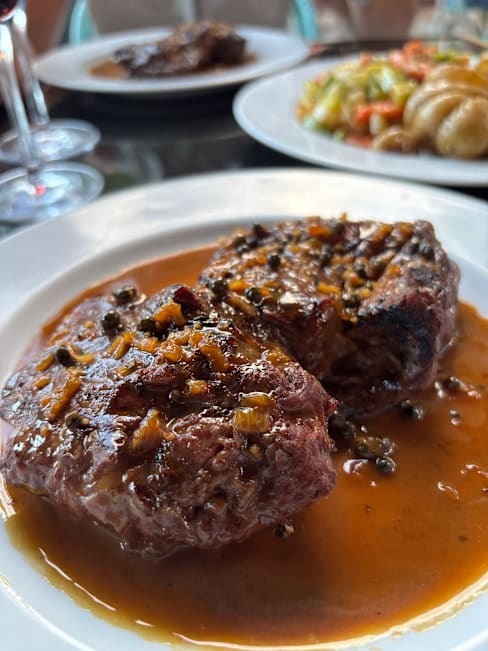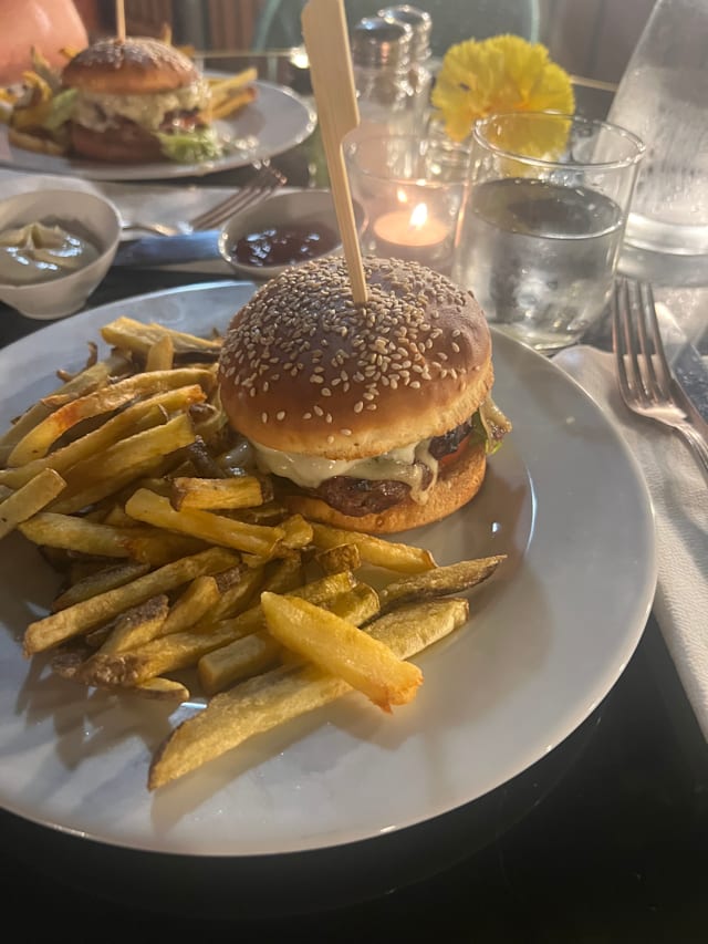 5/10The romantic atmosphere, the beautiful terrasse and a nice servant was a good start, but the chef has to improve. We ordered two French Rib-eye steaks (medium cooked) which was so chewy, tough and fuld of tendons. We were offered chicken instead, but refused as we waited 1 hour for the steaks. We paid the wine and left very disappointed.
