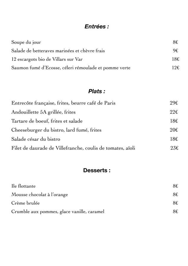 8.5/10A decent wine list and a relatively short menu of traditional bistro fare with a twist made dinner here very enjoyable. Portions are generous and quality very good indeed. This is home-made food, not prepared and therefore good value for money.