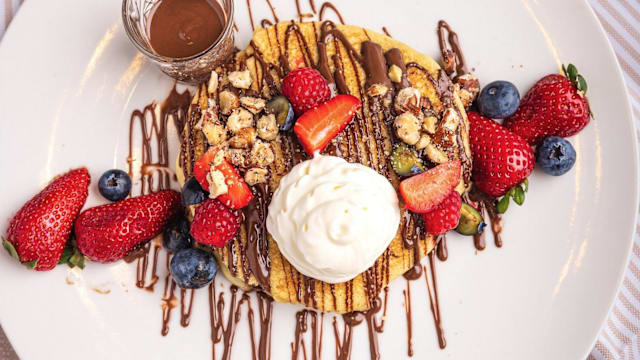 - Pancakes con crema chantilly, sciroppo d'acero e un mix di frutti di bosco freschi: mirtilli, lamponi e fragole.