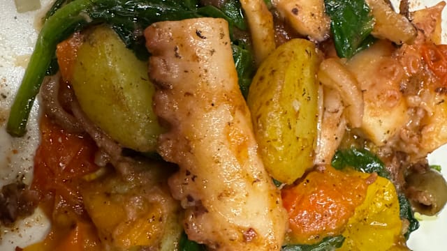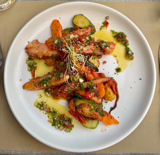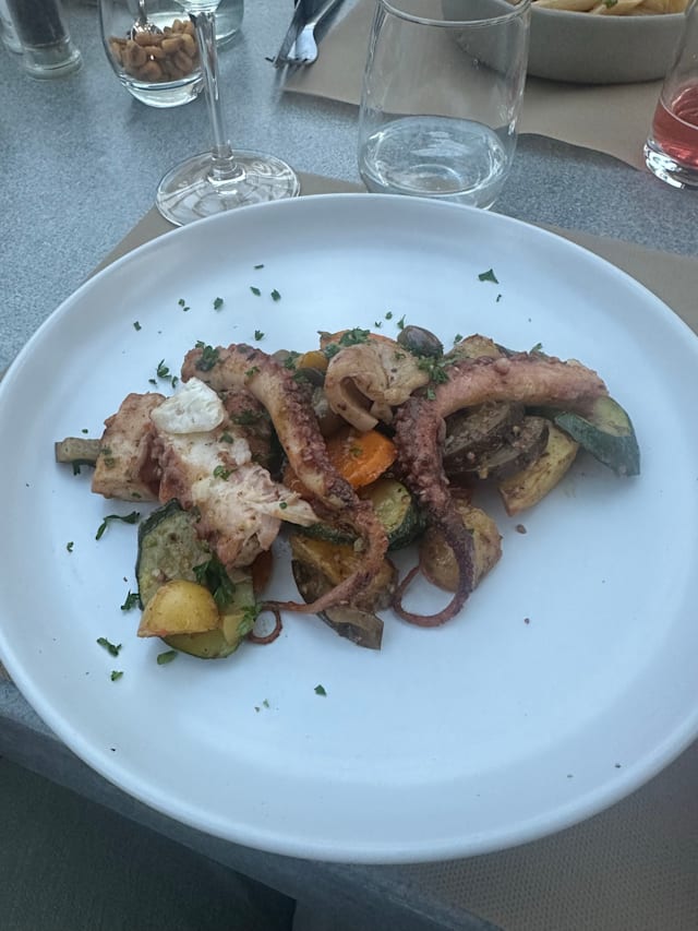 8.5/10Great food but poulpe and veggies were soaking in oil. Had to ask to change plate. But food taste was excellent. A group of people very loud inside as it was raining. But overall very nice. I will go back.