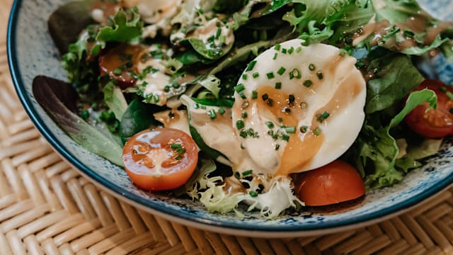 (mesclum,huevo duro, tomate cherry, jamon york y emmental)