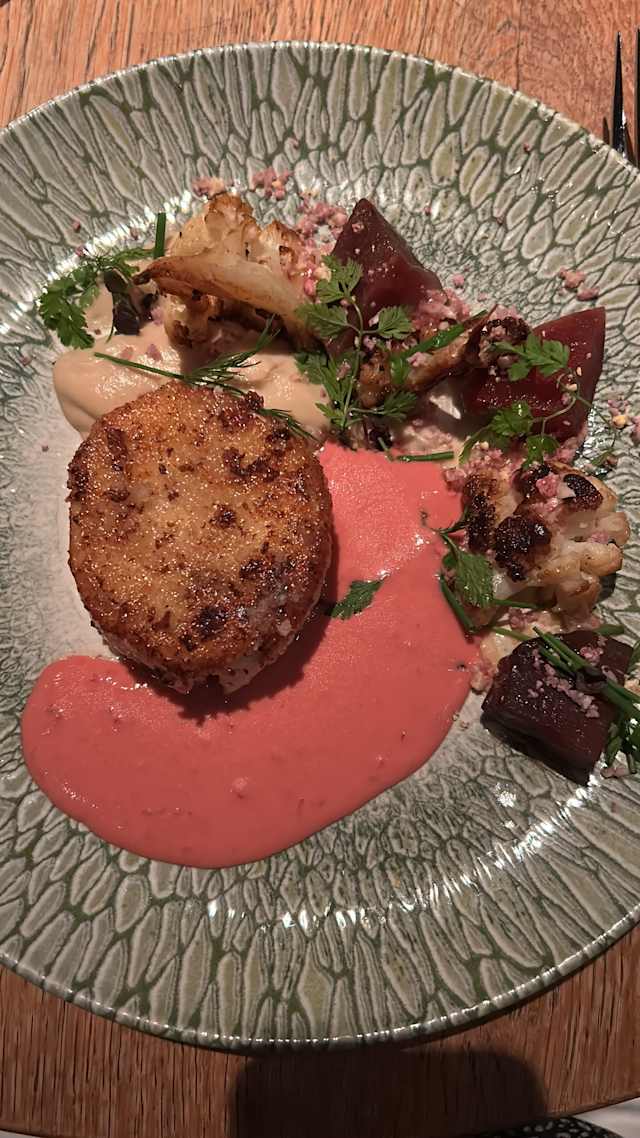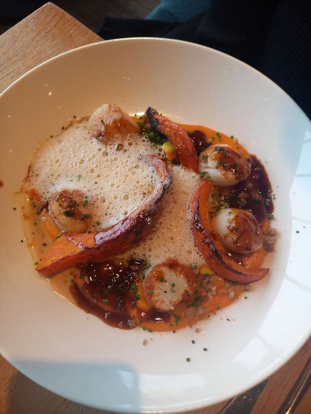 Gambas snackées et flambées au rhum épicé, purée de fenouil au curry, épinards en salade au beurre noisette, tuile croquante au sésame, bisque de crustacés.