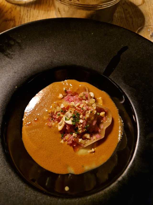 Gnocchi de pommes de terre, siphon d’un gratin dauphinois, jus végétal, champignons de Paris.