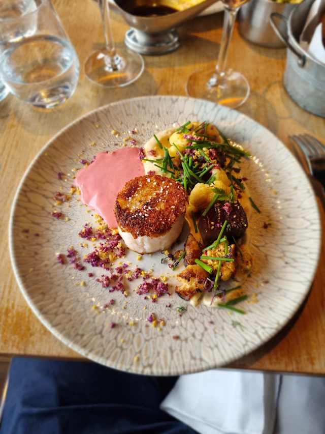 - Huîtres pochées, fromage frais au raifort, assortiment de radis red meat et blue meat mariné au vinaigre, sarrasin soufflé et condiment granny smith et salicornes