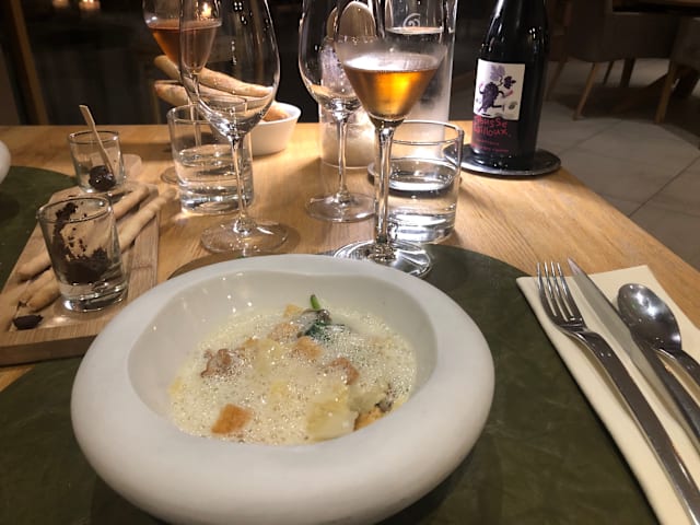 8/10An amazing location in a beautiful parc! Well worth the detour. Their Demeter white wine is to die for!!! Service was a bit rushed and confused and the accompaniment was way over salted but even that did not lessen the great experience! Will definitely detour to go back again and may stay a few nights at their hotel/spa.