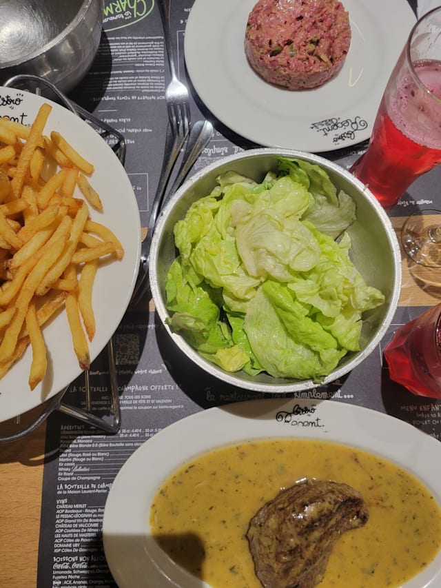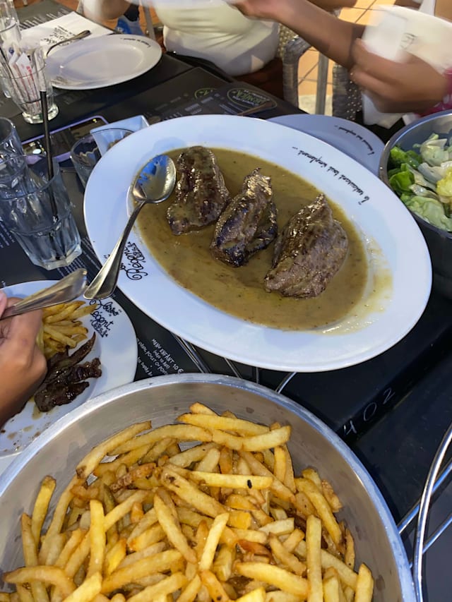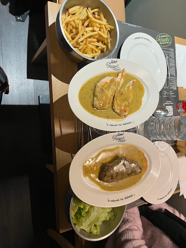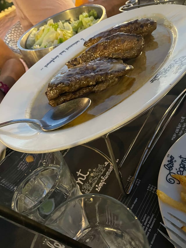 Boeuf et chèvre sauce charmèlcia et à volonté frites et salade