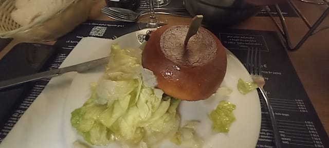 Servis avec la fameuse sauce charmélcia et le saladier de salade verte. Accompagnement à volonté : frites allumettes fraîches