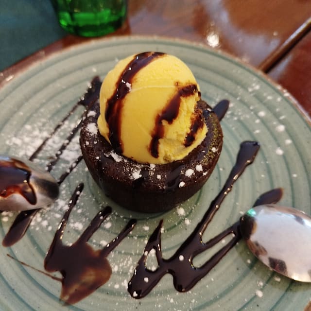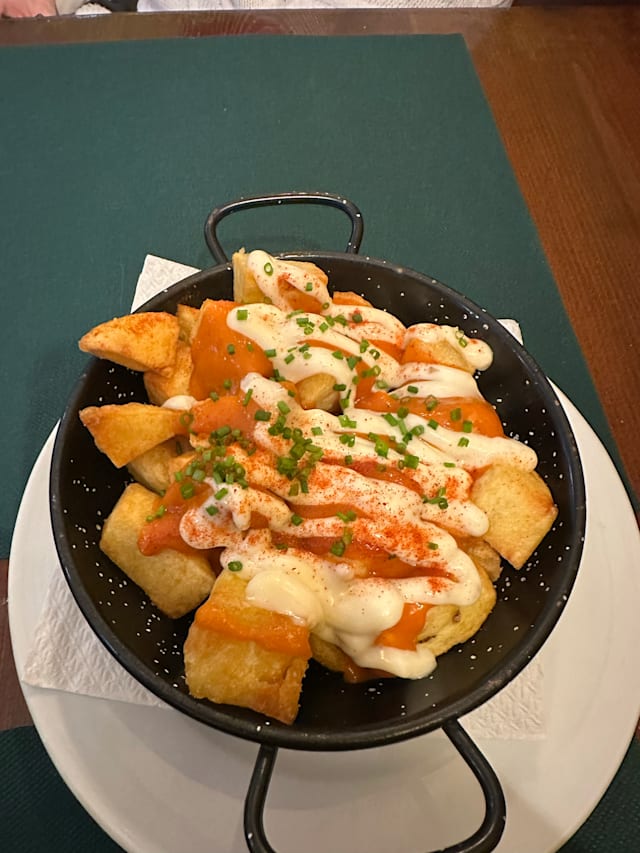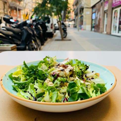 8.5/10One of the only restaurants on The Fork App that allows for a booking of one person, for the discount offer, and I appreciate that! Was impressed by the flexibility and personal attention from chef and staff. As a vegetarian who detests meat substitutes and products, especially in veggie burgers, I asked to send back the vegetarian burger I ordered as it both looked and tasted like meat. (Which is what people want often of course) . This was done without hesitation and with a smile. I changed to some tapas / starters of pan con tomate and the mushroom croquetas, which were really delicious!! I also had the goats cheese salad and asked for for cheese to be warmed some more and again, this was done swiftly and with totally courtesy and gentleness. No making the customer feel bad for requests, at all. There’s a terrace from which you can see the peaks of Sagrada Familia’s towers, between the trees which actually makes for a lovely view. Menu is just one page-but there’s something for everyone on it.