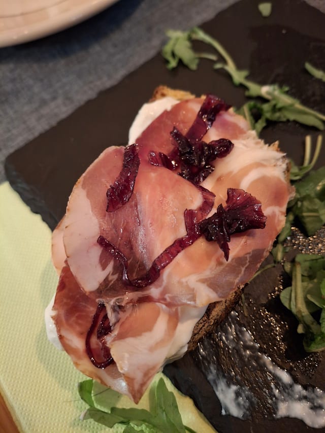 Pane bruscato, stracciatella di andria dop, capocollo di martina franca dop, cipolle caramellate al vino rosso home made