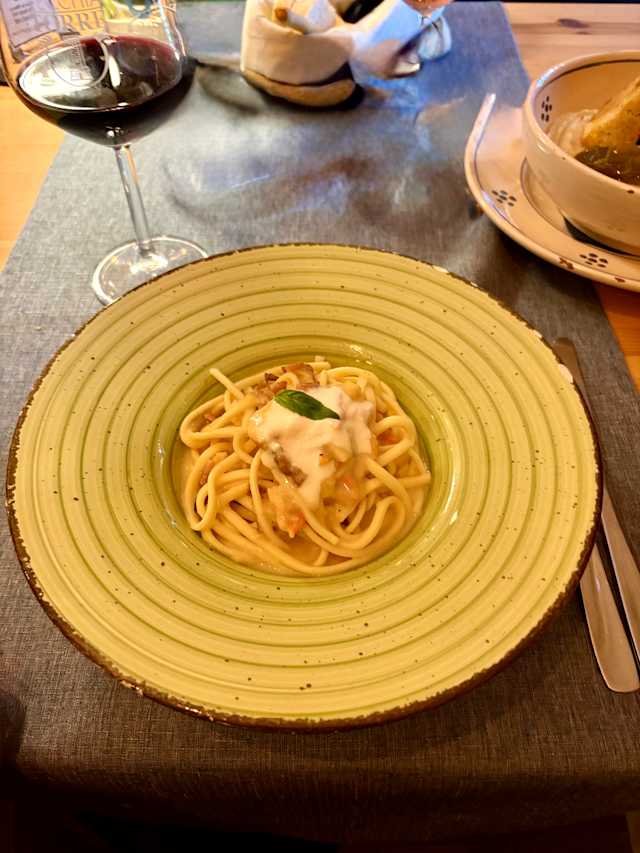 - Spaghetto alla chitarra aglio, olio e peperoncino, cubetti di pesce spada con crumble di prezzemolo, capperi, scorza di limone, lime e formaggio rodez finito con crumble croccante.