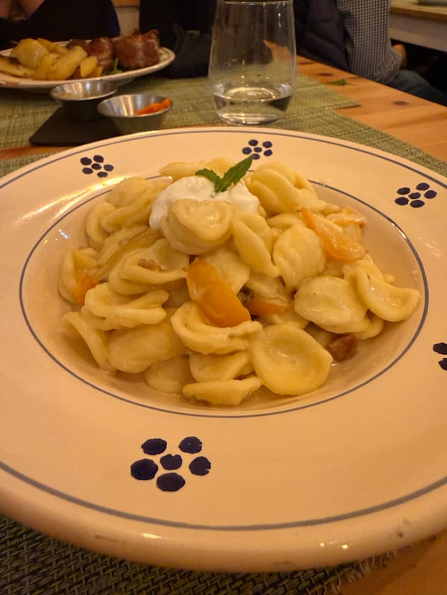 Orecchiette con pomodorino giallo schattirisciatu, stracciatella, guanciale di martina franca e basilico