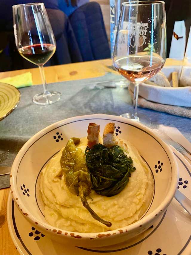- Purea di fave accompagnata da cicoria, peperoni grigliati e crostini di pane dorato.