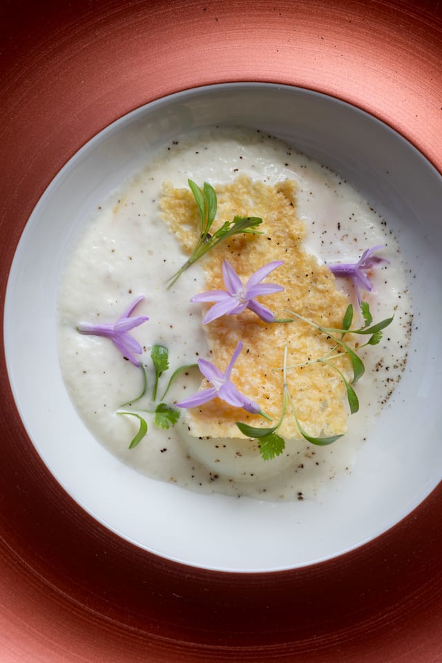 Œuf parfait, espuma de parmesan à la fleur d’ail