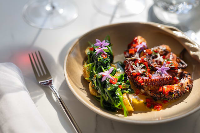 Poulpe grillé, poêlée d’épinards à l’ail, huile vierge, concassé de tomates