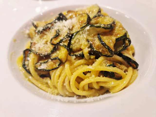 - Spaghetto aglio e olio peperoncino gamberi e foglie di parmigiano
