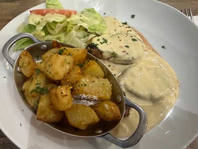 - (Poulet rôti on steak haché avec frites maison ou pâtes)
