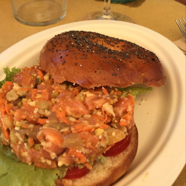 9/10Very easy and cosy atmosphere, off the busy tourist roads. Food was excellent and the service is very attentive, discrete and fast. I highly recommend the bagels with fresh fish. Excellent street food!