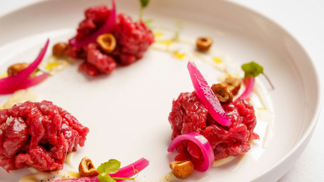 Dry Aged Beef Tartar, French Toast, Porcini Mushroom Mayionnaise and Parmesan Cheese