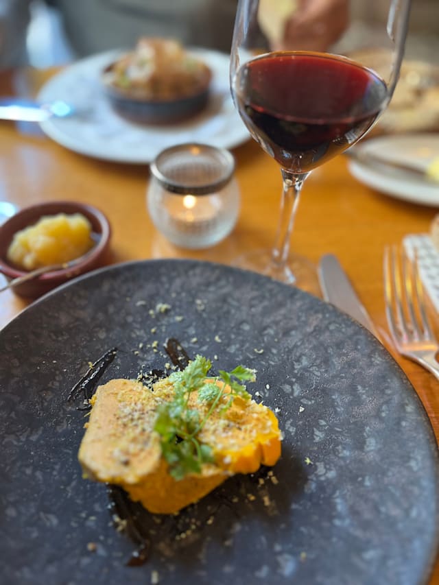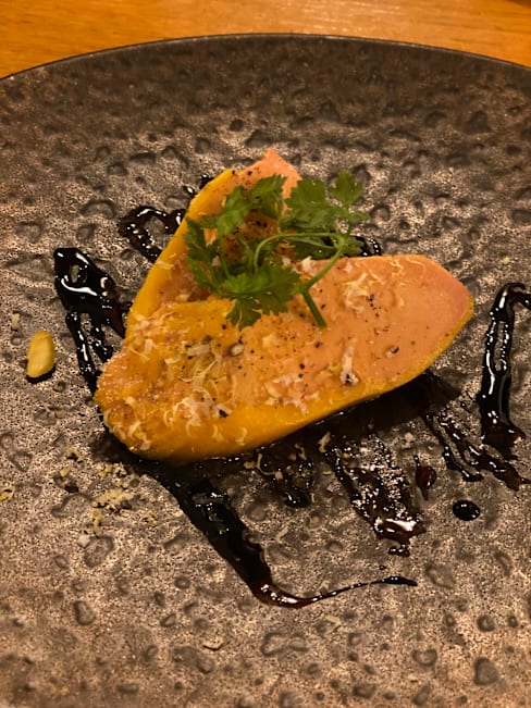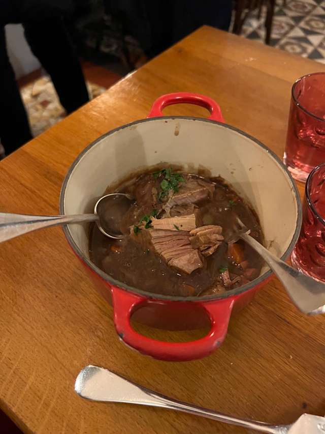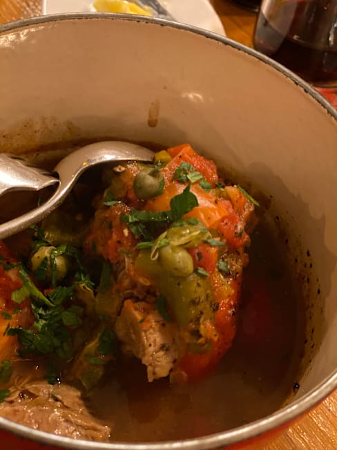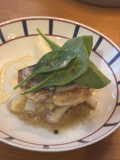 10/10What a lovely calm dinner after a long bustling day in the city. They started with an amuse buche, tasty and just the right size. We ordered a couple of the basque specials, the corn soup starter was spectacular, super corn flavor. The pork with beans and the chicken with rice were also tasty. We tried three wines, using their tasting option and all were good. The basque wines were the most u usual but the Bordeaux was exceptional. We finished with the basque cheesecake which was served with orange marmalade and was very good. They brought us complimentary madeleines which I usually find boring but these were very good,nutty and buttery. Highly recommend
