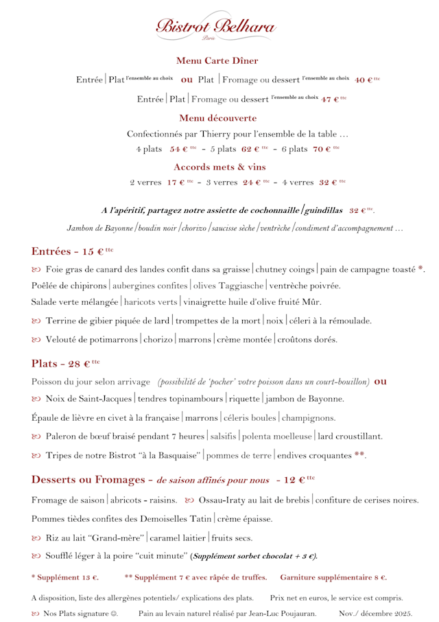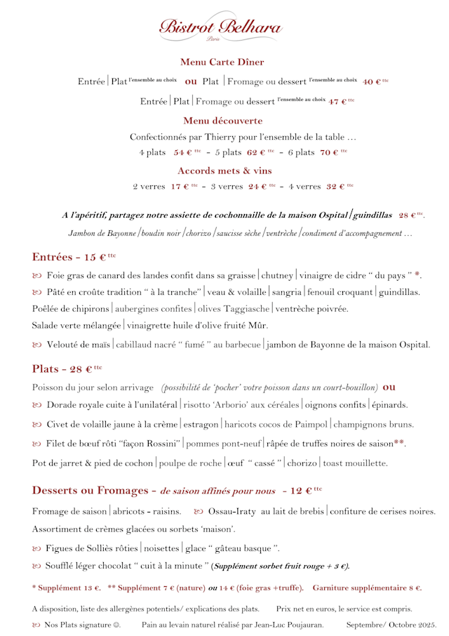 10/10The Bistrot Belhara was incredible! The food was so delicious and I savored every bite. I ordered the 4 course chefs tasting menu and everything was fabulous! I loved the Basque influence and this is a new favorite Paris restaurant of mine!
