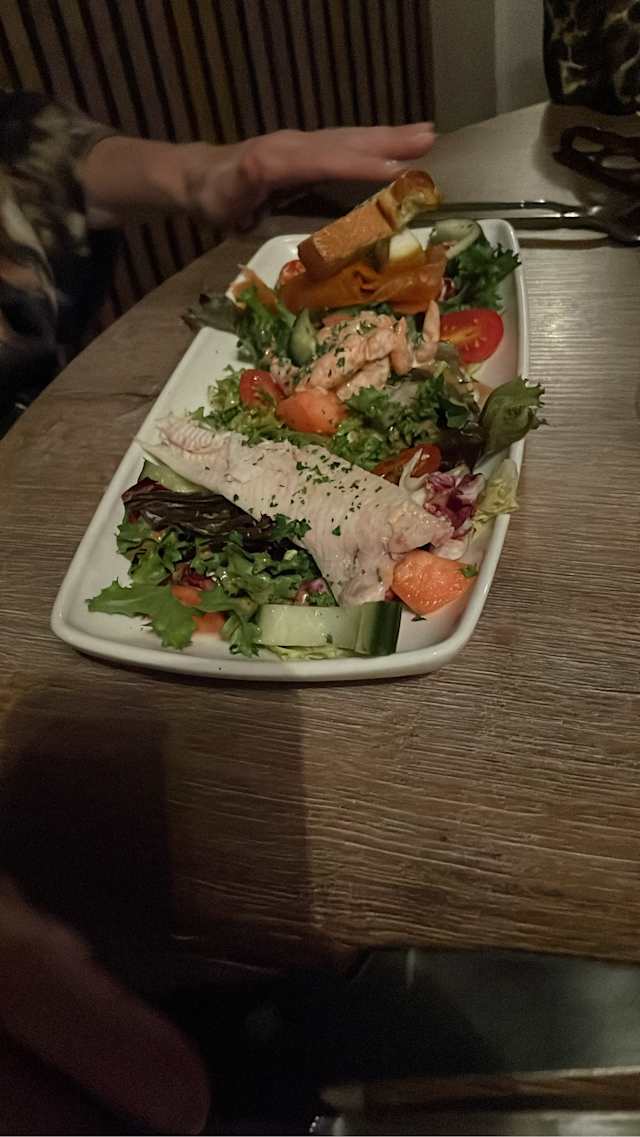 - Salade met gerookte zalm, gerookte forel en garnalen
