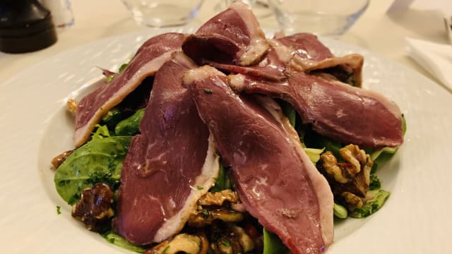 - Confit de canard des landes, frites ou gratin de pomme de terre, roquettes