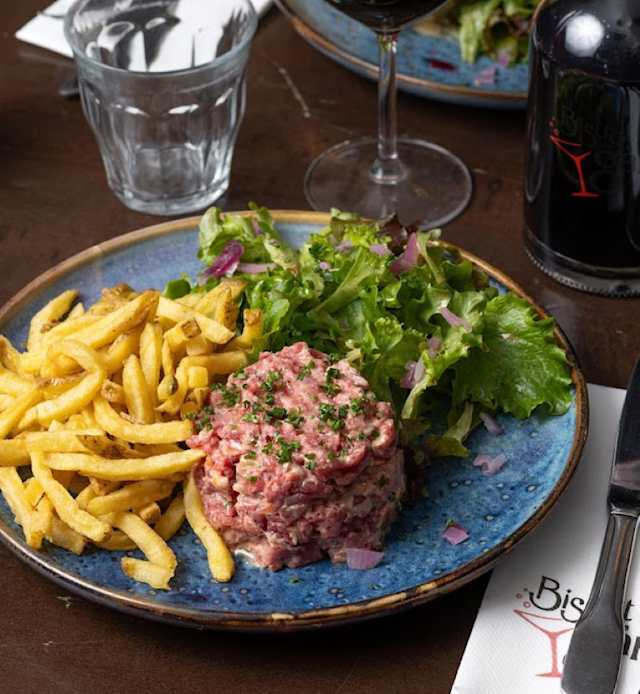 - Pièce du boucher (+/- 220gr), frites maison, salade