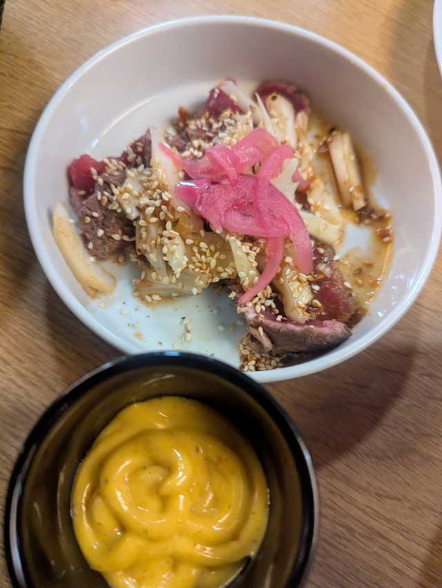 - Sauce fromage blang fines herbes et raifort, pickles de légumes, frites fraiches
