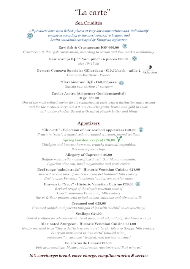 10/10Wonderful experience. The ambience at night, with excellent service and outstanding food plus a stellar wine list made this the highlight of our nights out in Venice.