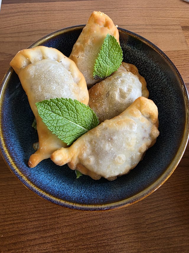 Petits chaussons croustillants farcis de viande hachée épicée, oignons et pignons de pin