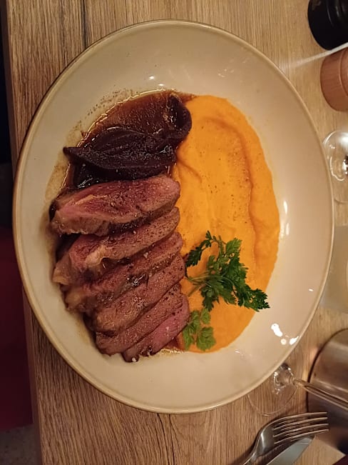 Dear Guest, Thank you for your kind words about our onion soup and we’re glad you enjoyed it. Regarding the duck, we would like to clarify that it is served with a honey and rosemary sauce, not a barbecue sauce. We appreciate your feedback and hope you will enjoy it even more on a future visit. Looking forward to welcoming you again soon. Best regards, Le Bistrot des Fables