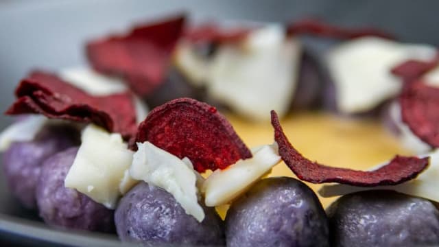 Polpo al vapore, salsa san marzano 102°, patata allo zafferano, chips di verdure, polvere d’olive