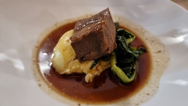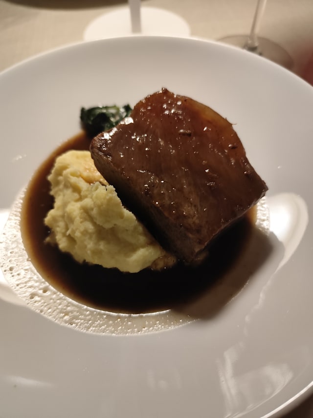 Guancia a lunga cottura ed il suo fondo, peperoni ripassati con battuto di olive e capperi