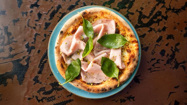 Fior di latte, desto de pistache, mortadella di bologna, granule de pistache, hulle d'olive