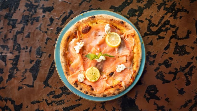 Sauce tomate, fior di latte, ricotta de brebis, n'duja, saucisson piquant. Ventricina, basio, huile d'olive