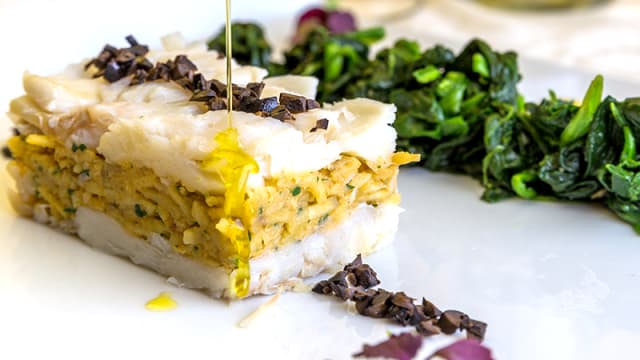 - Cod fish “au confit” in olive oil, garlic, rosemary, chickpea purée and baby spinaches