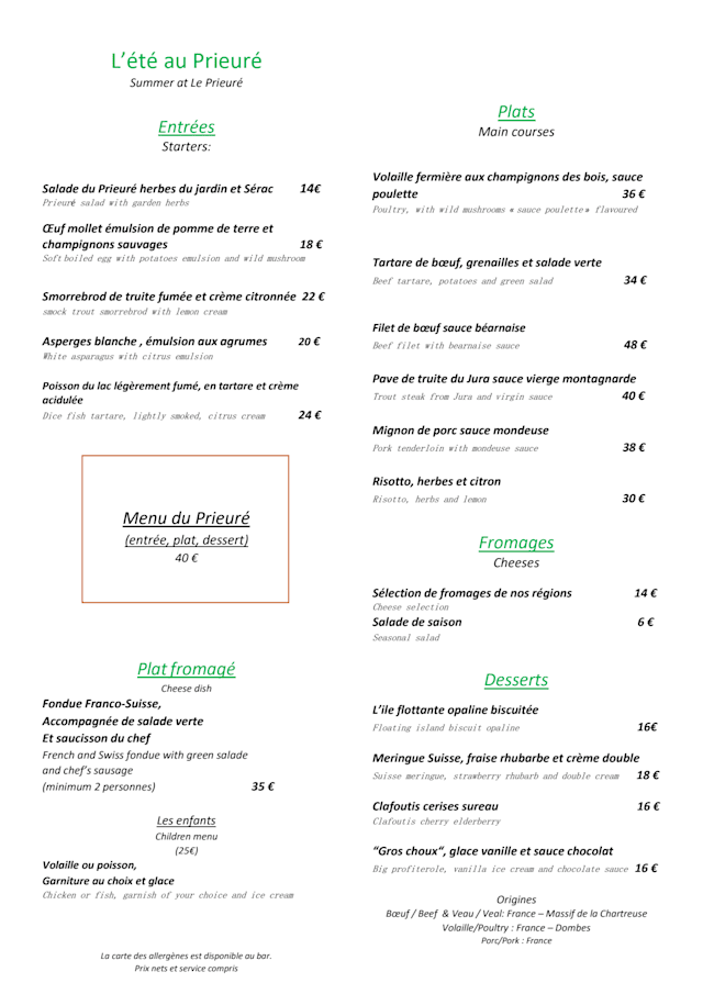 Au Prieuré, la cuisine a des accents savoyards et s’inspire largement des recettes de famille, des traditions revisitées façon Emmanuel Renaut, des plats de brasserie et des pépites du terroir. Le terroir y va de quelques produits chouchous sélectionnés par le chef aux 3 étoiles auprès des producteu...