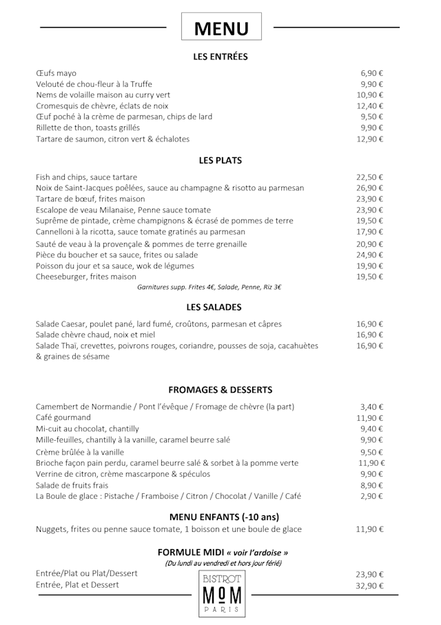 8/10The food and staff we good. The price was as expected for Paris. We had better meals in Paris but Mom is a good choice and right next to our hotel so it was very convenient.