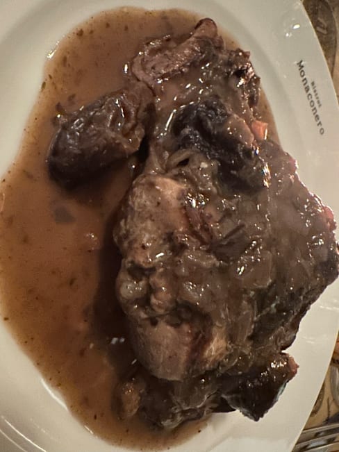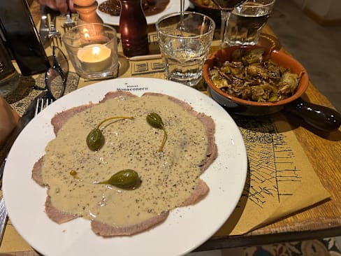 8/10Typical Trattoria seating, very intimate and across the river from the tourist hustle and bustle. I had the Guancia, braised pork cheeks in a hearty red wine sauce. One cheek was excellent succulent and fork tender, the other was tough. My date ordered the sliced veal with a peppercorn tuna sauce. We lost something in the translation as it was deli sliced thin served cold as was the sauce. Would not order again. The dessert was excellent and the waiter gave us a choice of local digestifs.