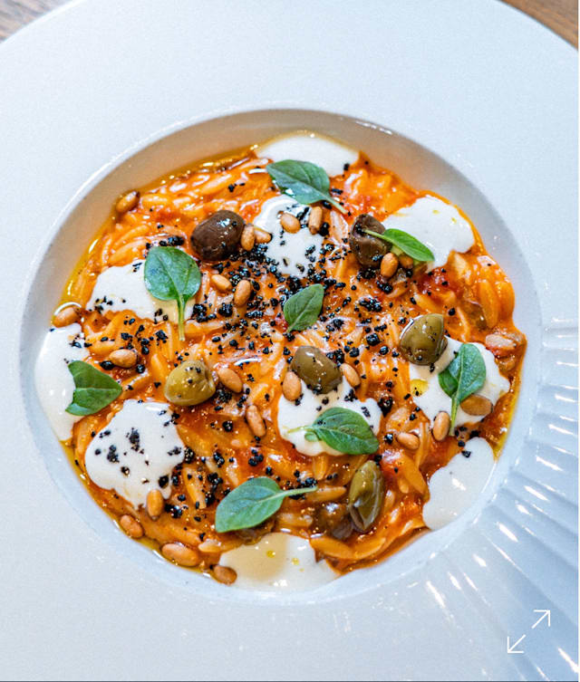 Pâtes d’orzo cuites comme un risotto, sauce tomate, ail, câpres, olives et anchois, crème de burrata et pignons de pin.