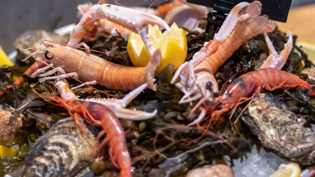 I cotti: 1 astice, 1 granchio, 4 gamberi « bouquet », 6 bulots // i crudi: la nostra selezione di 6 ostriche, 2 capesante, 2 vongole bretone, 2 mandorle di mare, 2 tartufi di mare o fasolari // burro, maionese, limone, salsa “mignonette” e pane