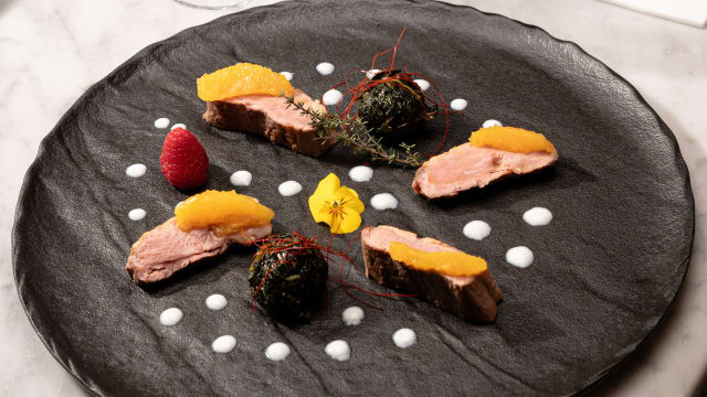 Anatra al mirto con granella di sua pelle e mousse di patate alle erbe aromatiche