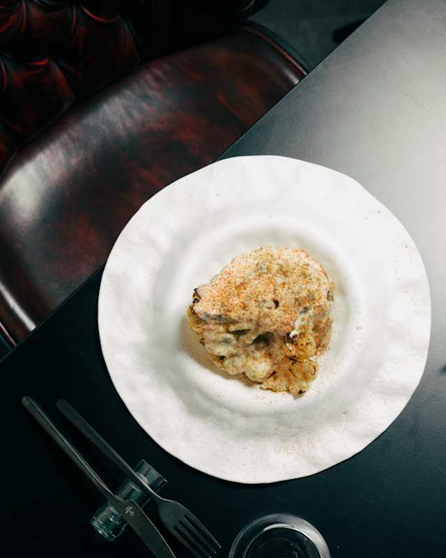 - Cavolfiore bruciato con fonduta di caciocavallo podolico, polvere di capperi e peperoncino