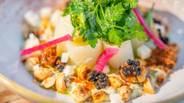 (42,50€ / personne) Secreto de porc ibérique cebo issu des plus beaux porcs noirs ibériques d'Espagne par la maison Casalba, dans la région d'Extremadura. Viande grillée au feu de bois, laqué au soja et câpres, légumes grillés.