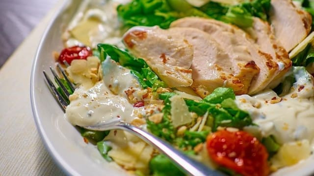 Lattuga romana, pomodorini canditi, maionese di yogurt ed erba cipollina, suprema di pollo c.b.t., pepe rosa, scaglie di parmigiano, crostini di pane agli aromi e spolverata di mandorle tostate e saltate