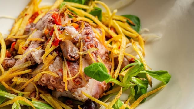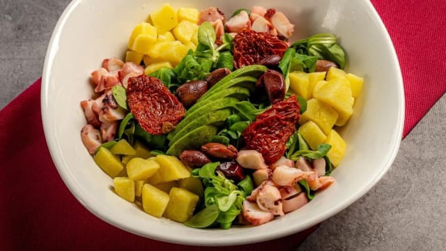Valeriana, patate lesse, olive taggiasche, pomodori secchi, dadolata di avocado e tentacoli di totano